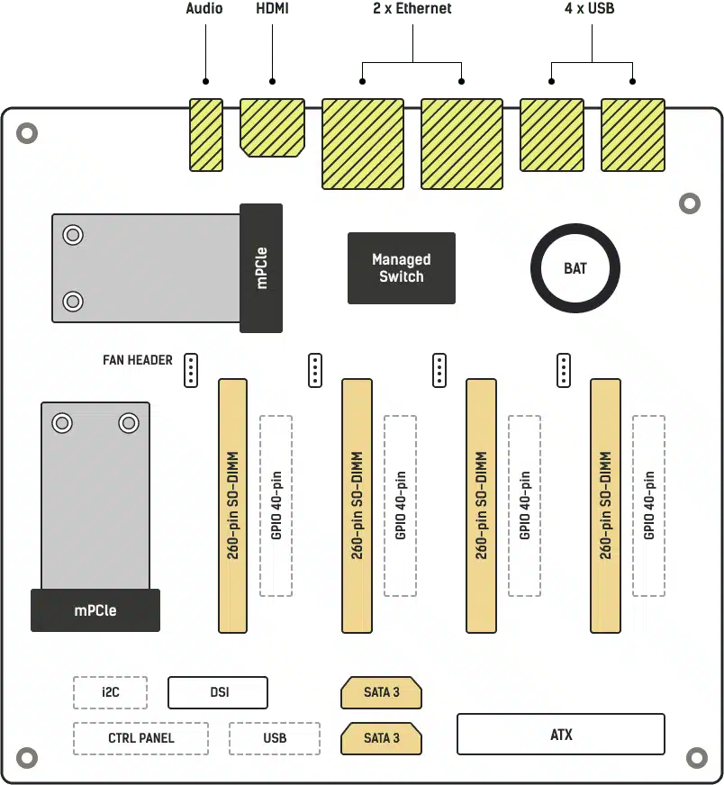 As a result, we came to a cluster unit with 4x 260-pin nodes, 2x mini PCIe (Gen 2) ports, 2x SATA (Gen 3) ports. The cluster board has a Layer-2 Managed Switch with VLAN support. You can use the mini PCIe port connected to the first node to install a network card and get another Ethernet port or connect a 5G modem and make the first node perform as a router.